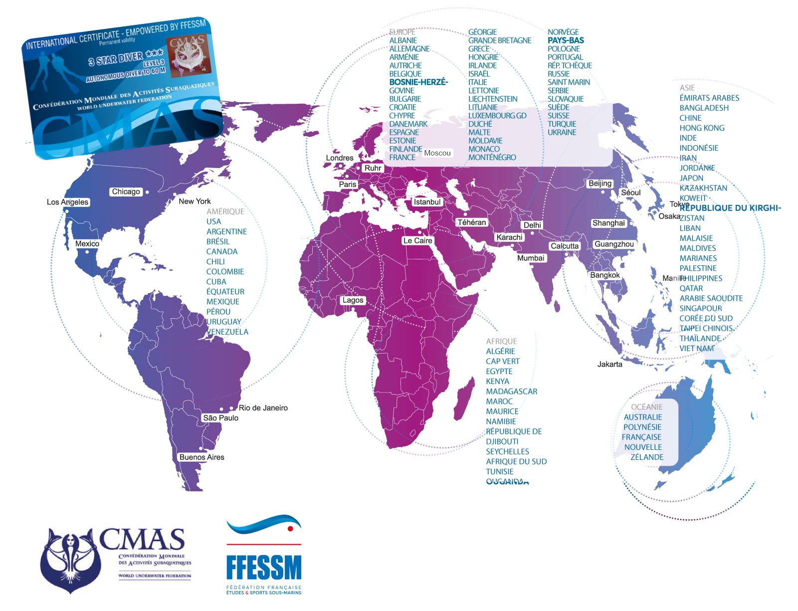 La CMAS est une organisation internationale qui regroupe de nombreuses fédérations nationales de plongée. Elle établit des normes de formation et de sécurité pour la pratique de la plongée sous-marine. Grâce à son affiliation à la CMAS, la FFESSM garantit que ses formations respectent ces normes et sont reconnues à l’échelle internationale.